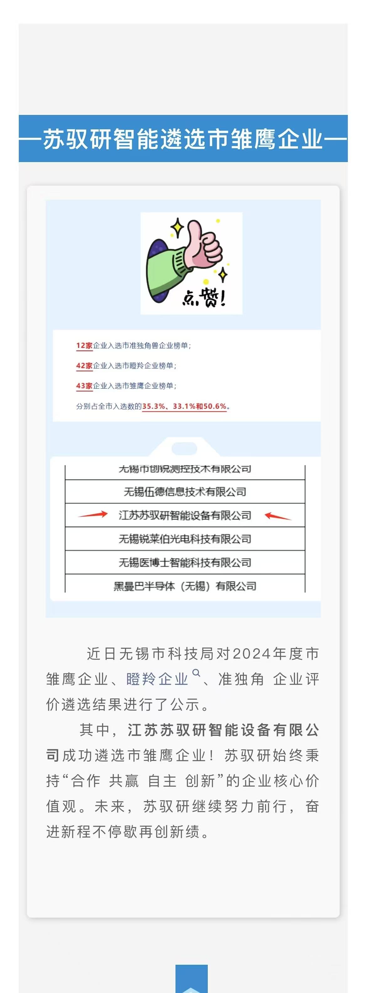 熱烈慶祝蘇馭研智能遴選市雛鷹企業(yè)